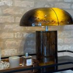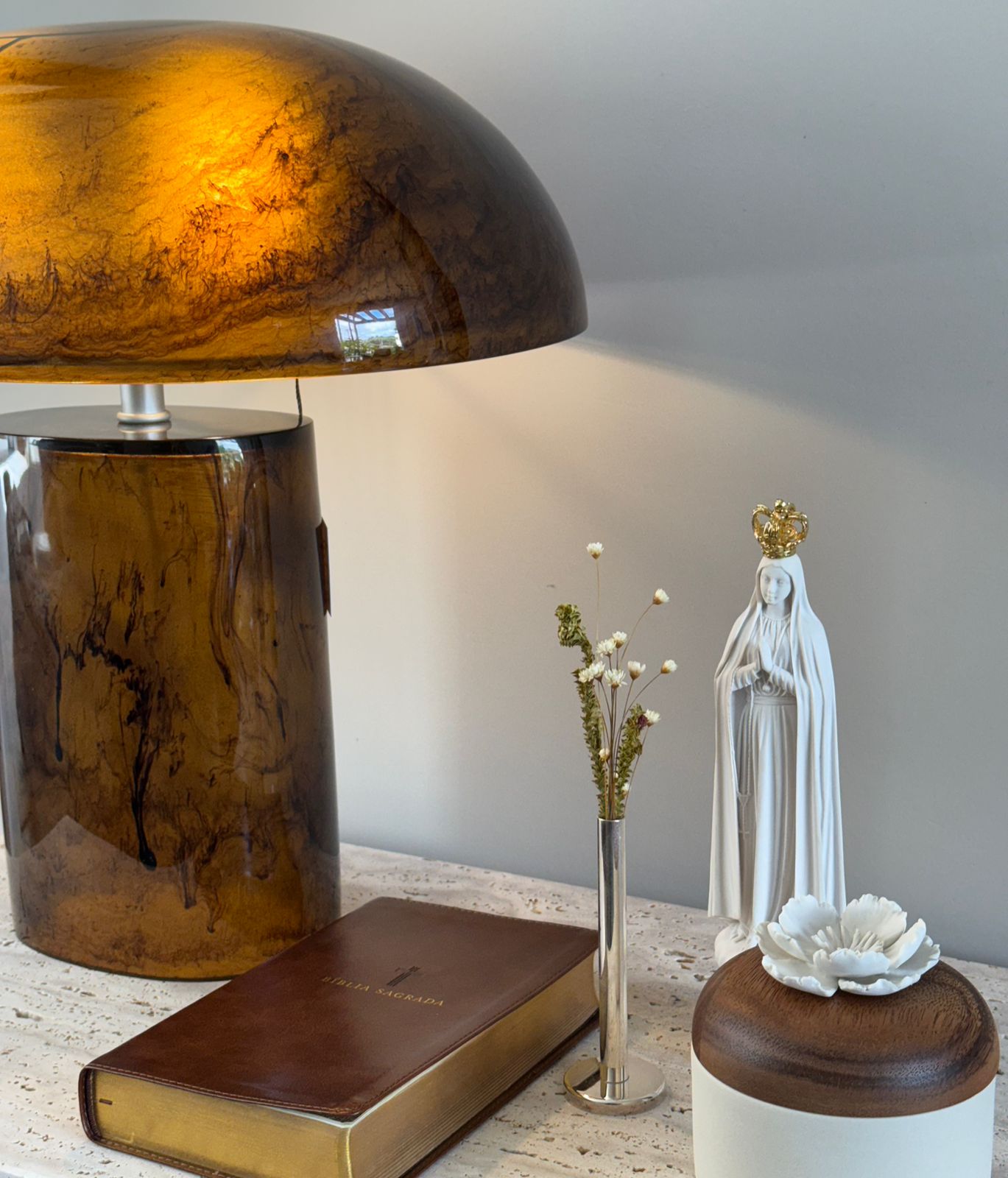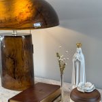 Abajur todo produzido em resina com a base e cupula na cor whisk, imponente e marcante no decor.