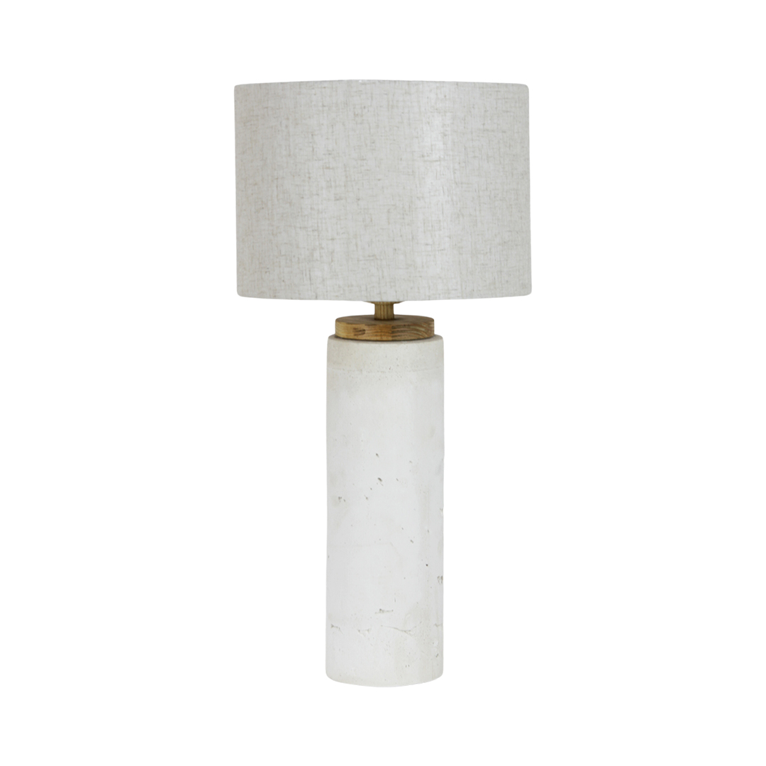 Abajur Goiatuba: proposta diferenciada com a base em cimento e madeira, e cúpula em algodão.