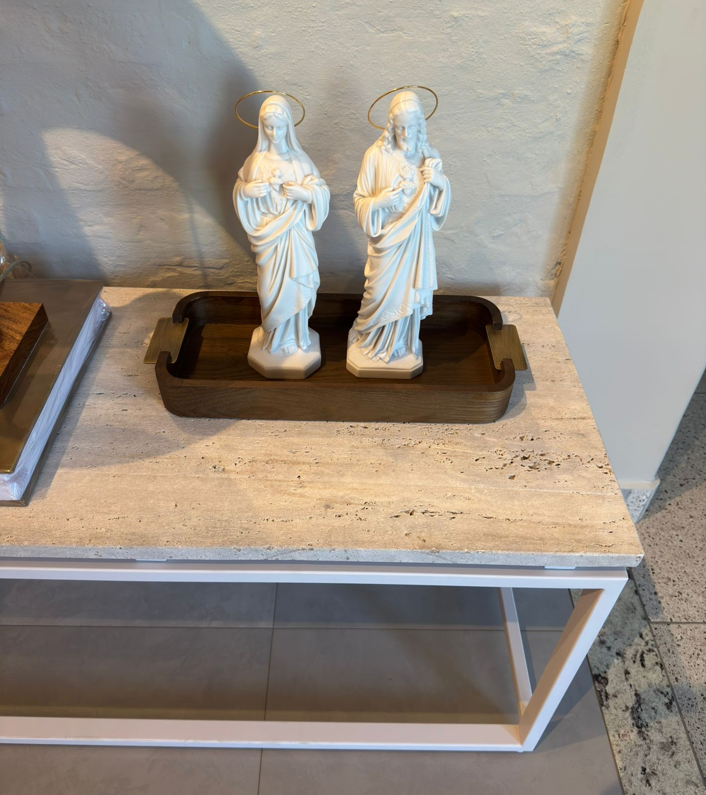 Aparador com a base em metal na cor off white e tampo em pedra natural travertino romano.