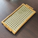 Bandeja de bambu com alça e fundo em vidro com palha natural.