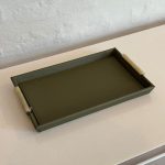 Bandeja decorativa em madeira com revestimento estilo couro em PU verde e alça com detalhe dourado: charmosa, perfeita para organizar com muito estilo!