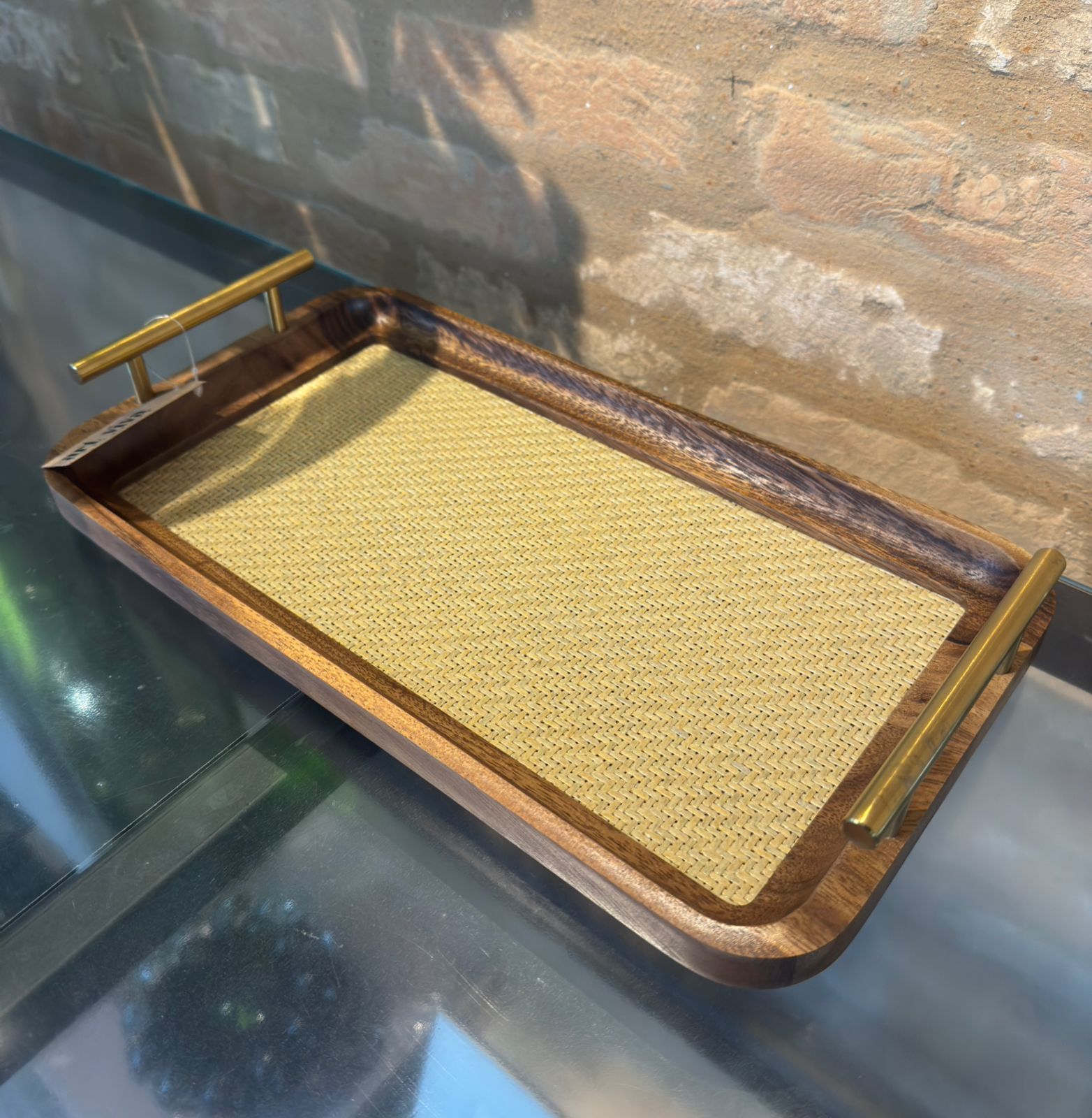 Bandeja em madeira e fundo de rattan com alça dourada: charmosa, traz um toque diferenciado à sua decoração.