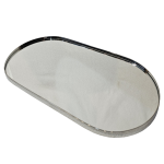 Bandeja de formato oval toda produzida em aço inox com o fundo espelhado.