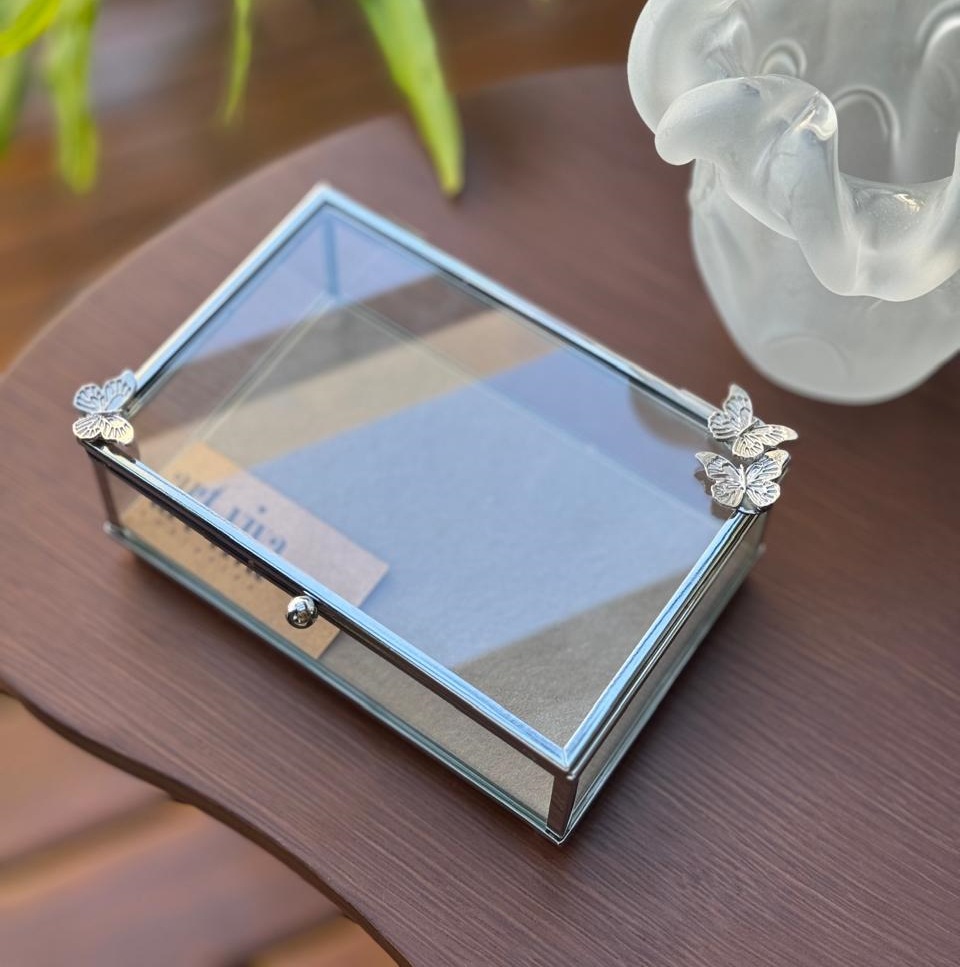 Caixa decorativa de vidro com hastes em metal prata e detalhes de borboletas na tampa: pura delicadeza e romantismo na sua decoração.