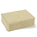 Caixa decorativa em metal dourado estilo fibra natural, com interior todo espelhado: charmosa e versátil para usar nos mais diversos espaços.