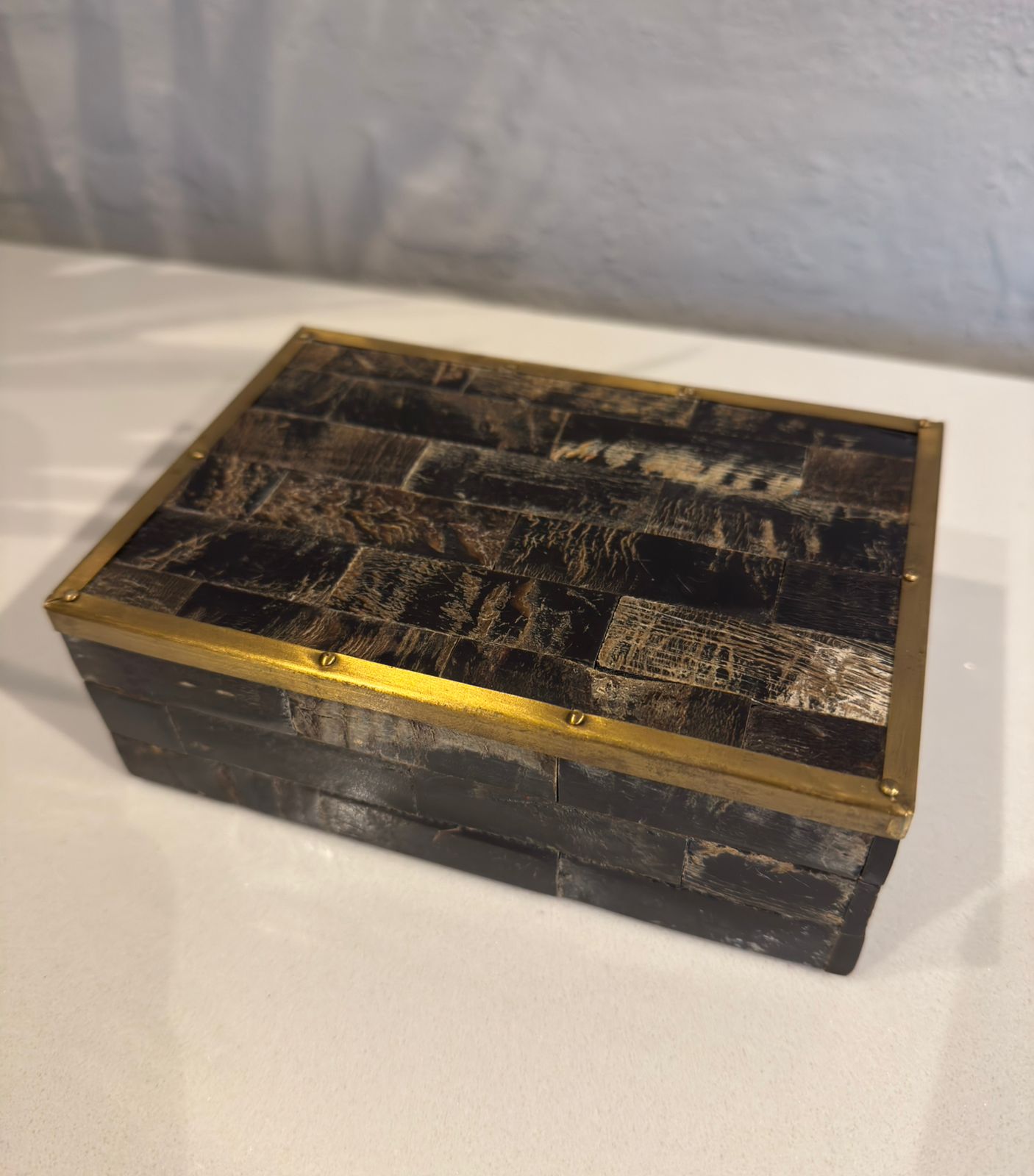 Caixa decorativa cheia de charme na cor marrom com hastes douradas. Resistente, tem o interior em madeira.