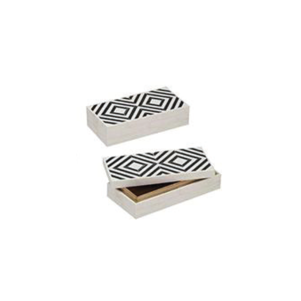 Caixa decorativa estilo osso com estampa geométrica preto e branco.