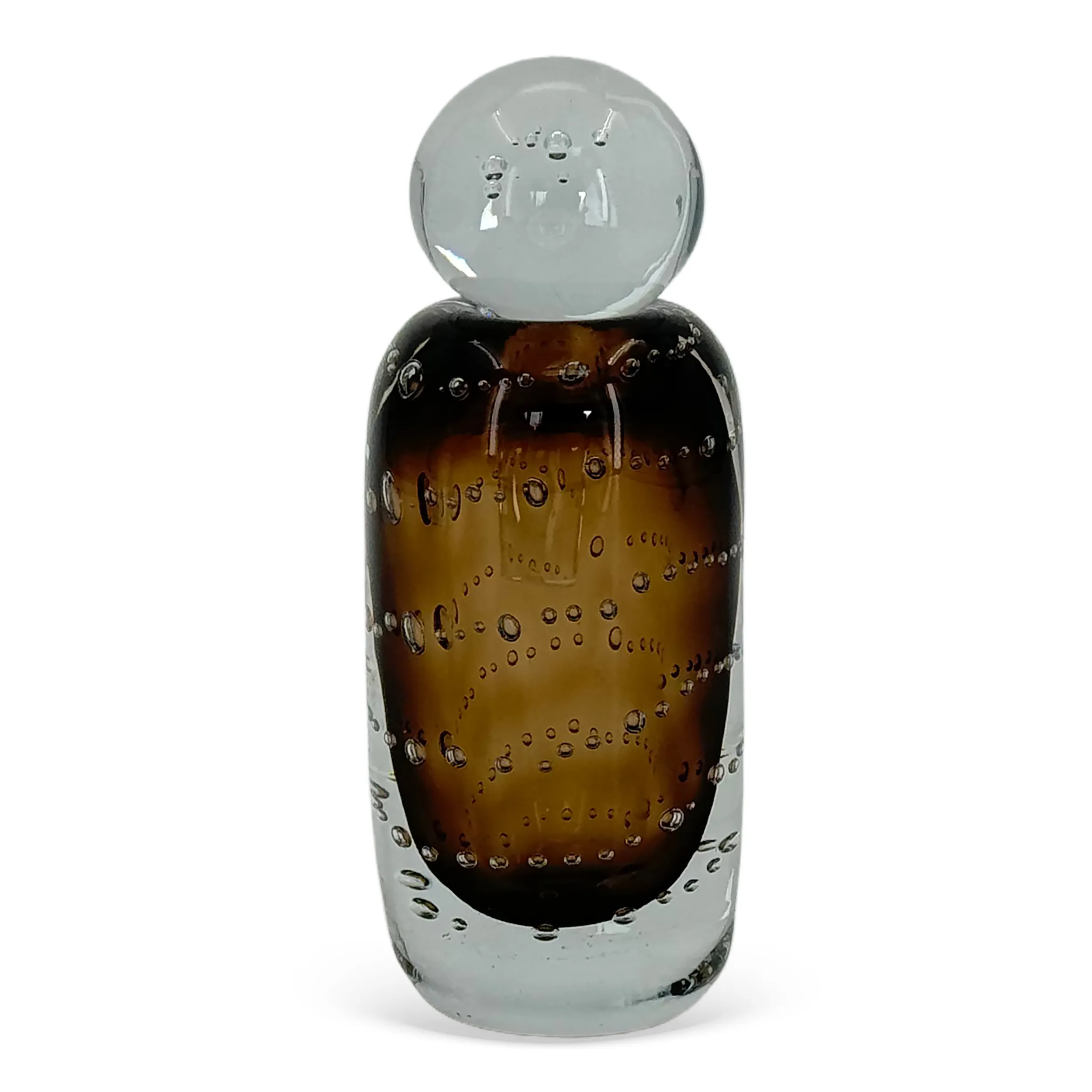 Garrafa decorativa em vidro âmbar com tampa, e detalhes em bolhas laterais estilo murano: charmosa e elegante pra sua decoração!