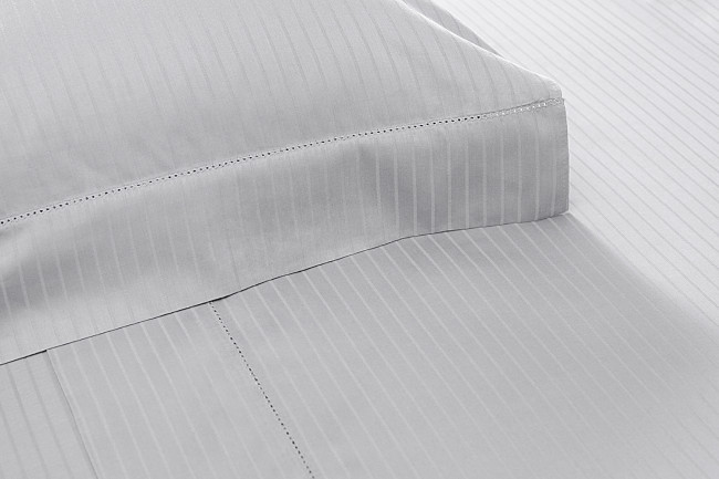 Tecido adamascado com desenho de listras foscas e brilhantes. Em cetim 300 fios, esse conjunto vai te surpreender pelo toque macio e suave. Acabamento com ponto ajour nas abas das fronhas e sobrelençol.