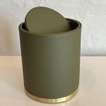 Lixeira decorativa de bancada em madeira com revestimento estilo couro em pu verde com detalhe dourado na base: charmosa e funcional!