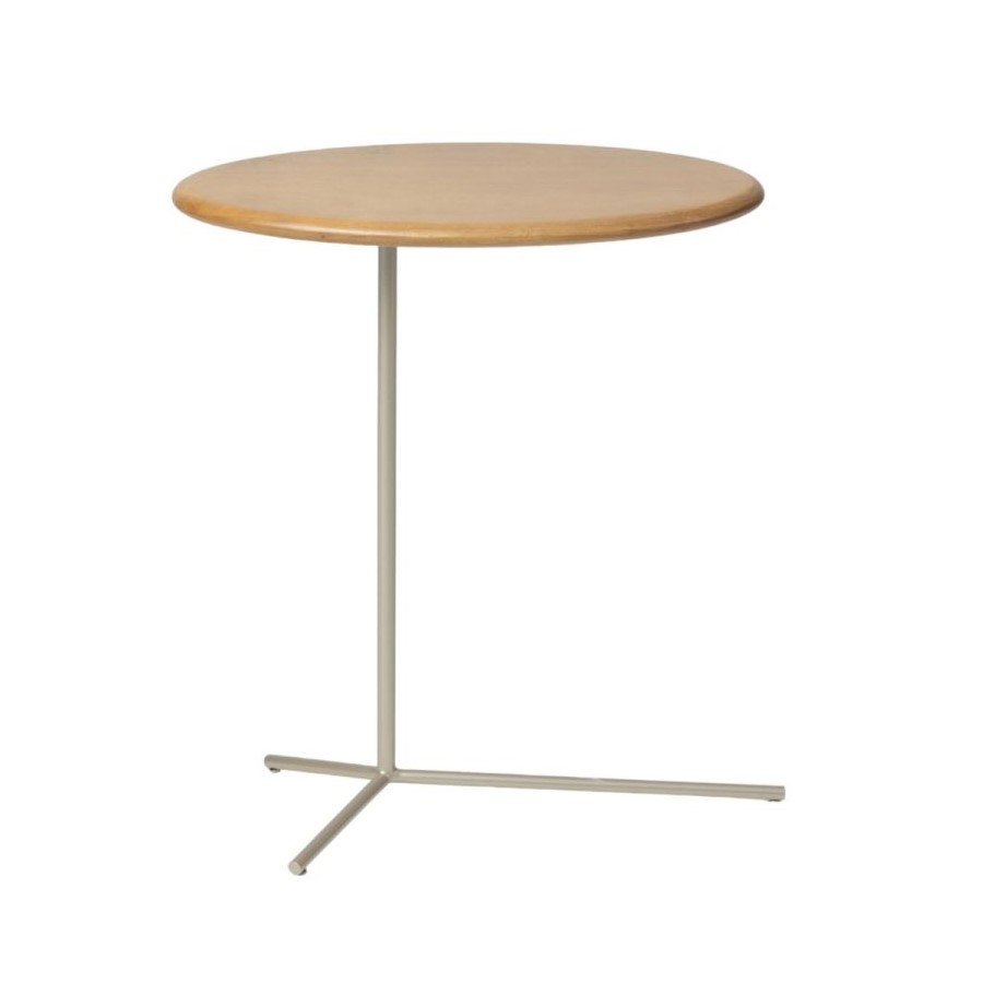 Mesa de apoio Eva com tampo amadeirado na cor damasco e base em metal preto fosco.