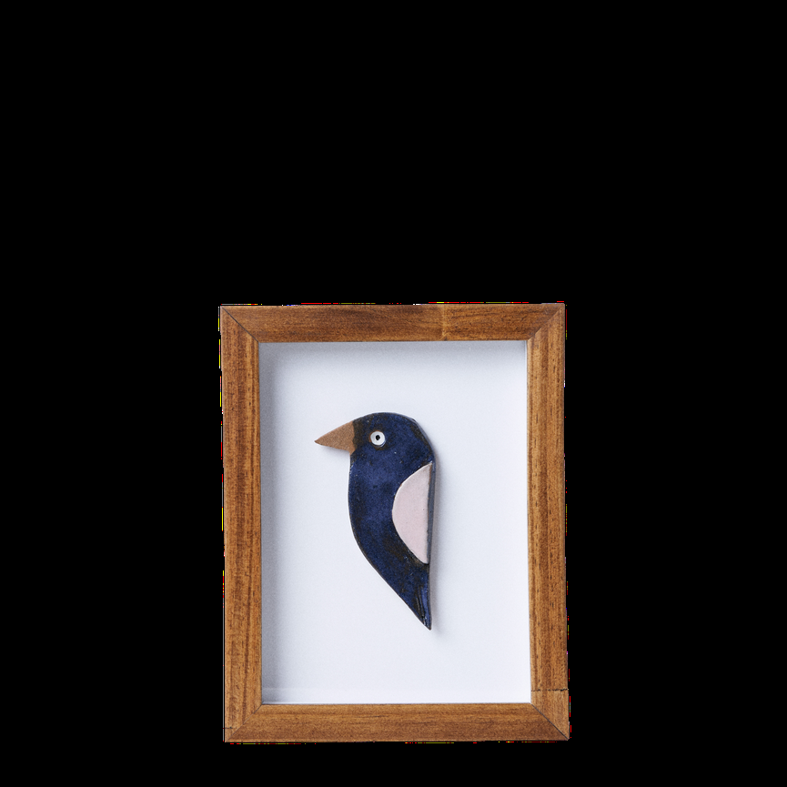 Quadro decorativo com escultura de pássaro em cerâmica.